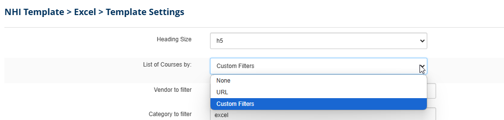 The NH Course List template is designed to display a list of courses, filtered by Vendor (Brand) or Category. You will set the filtering term in the Template Settings.