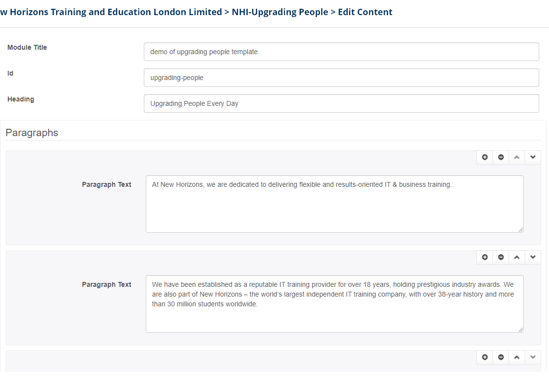 Originally designed to add an "Upgrading People" block following some of the existing New Horizons home pages, this template can be used any time that a prominent heading followed by a series of paragraphs is required.